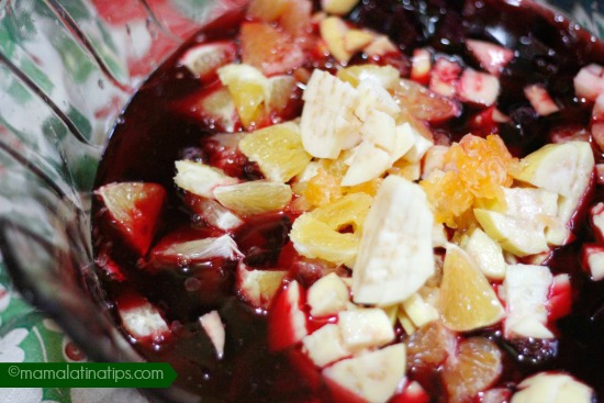 Verás que la fruta flota en una exquisita combinación de jugo de jamaica y betabel o remolacha. Esta receta hace lo suficiente para alimentar a mi familia de 35 personas, yo normalmente me como dos o tres tazas cada Navidad.