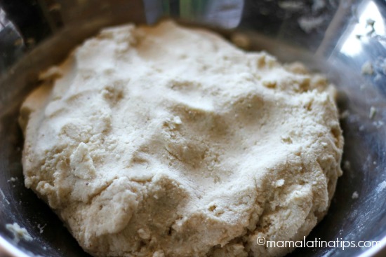 Ahora para los tamales. Combina las cuatro tazas de Maseca Nixtamasa con las 2 2/3 tazad de agua caliente y la sal, mezcla hasta que todo se integre muy bien, puedes usar tus manos si se te facilita más. La masa lucirá así: