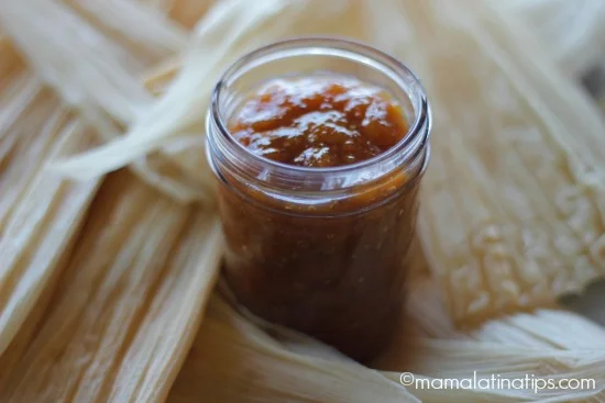 El orden de esta receta es poner las hojas de tamal a remojar, hacer la mermelada y hacer los tamales al final.