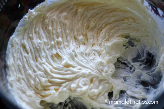 Añade el azúcar, y el polvo para hornear y mezcla por otros 2-3 minutos hasta que todo se integre muy bien.