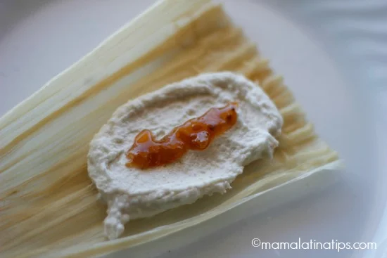 Esparce 2 o 3 cucharadas soperas de masa sobre la hoja de tamal, agrega la mermelada en el centro y cierra la hoja de manera tal que se cubra la mermelada con la masa, dobla la hoja para cerrar el tamal y repite hasta que hayas terminado con todos tus tamales.