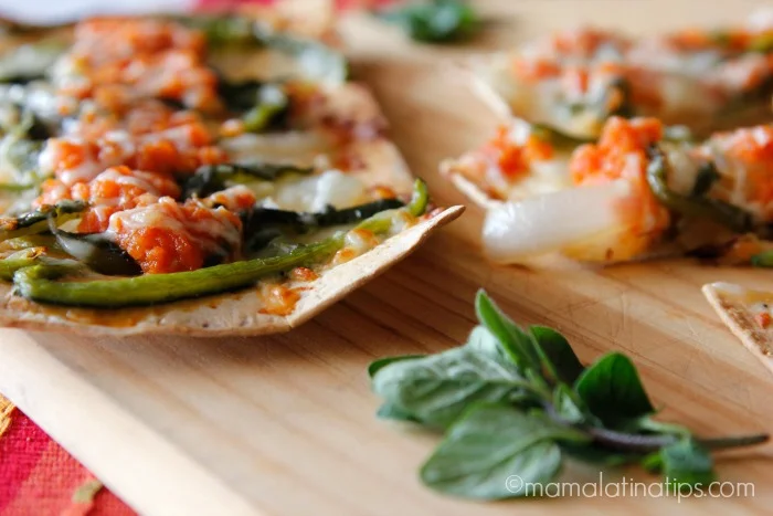 Pizza de Chile Relleno: Una pizza diferente, hecha con flatbread pero con todo el sabor mexicano de los chiles rellenos.