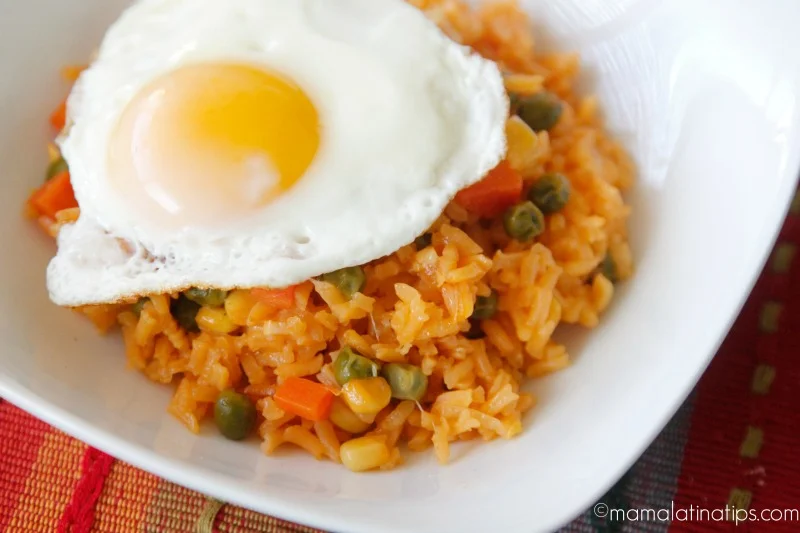 Arroz Rojo con Huevos Estrellados: Reconfortante y fácil. Empieza con una base de arroz rojo con queso, pon un huevo estrellado encima y cubre con la salsa de tu gusto. Fácil y rápido.