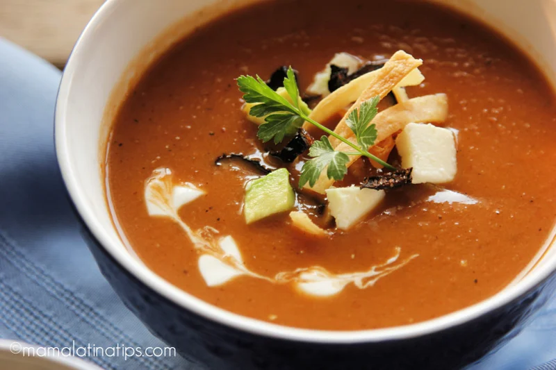 Sopa Tarasca: ¿Quién dice que el platillo principal no puede ser una sopa? La sopa tarasca está hecha a base de frijoles, una fuente muy buena de proteína, y servida con chile ancho frito, aguacate, queso y crema. Acompaña con una ensalada.