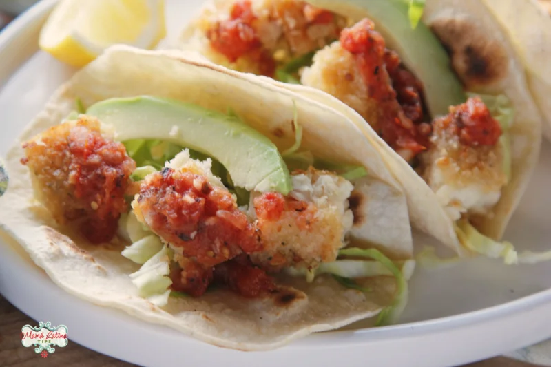 Tacos de Pescado Empanizado: Estos tacos están listos en un dos por tres. Van servidos con una salsa de chipotle picante, aguacate. lechuga y limón.