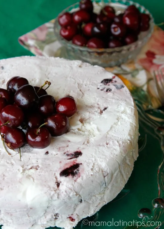 Con la ayuda de una espátula suaviza la superficie del helado. Decora con cerezas y sirve inmediatamente.