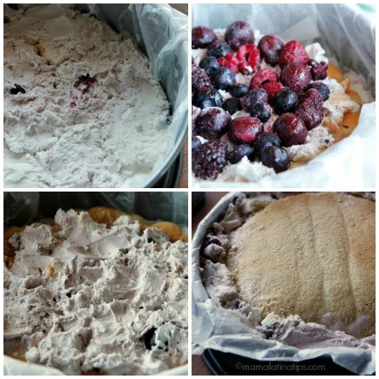 Después de las 8 horas. Engrasa el molde springform (esto ayuda a que el pastel se pegue al molde) y cubre el fondo y paredes con papel encerado. Agrega una capa de 1/2 pulgada de helado Breyers® Cherry Vanilla en el fondo. Toma uno de los pasteles y con un movimiento rápido voltéalo sobre el helado, despega el papel pergamino que seguro está sobre él. Asegúrate de que el pastel está en el centro. Esparce otra capa delgada de helado sobre el pastel, luego añade una capa de frutillas congeladas Dole® Cherry Berry Blend. Cubre con el segundo pastel y luego llena el espacio entre el pastel y las paredes del molde con más helado.