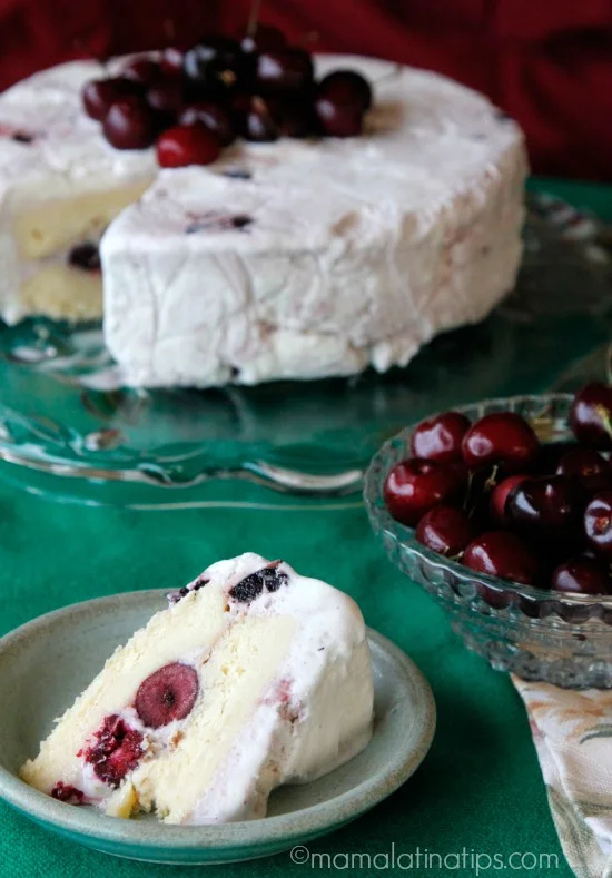 ¡Ha como me gustó! Déjame contarte porque. Primero, me encantan esas hermosas cerezas del helado Breyers de Cereza y Vainilla (Cherry-Vanilla) que se asoman y crean ese marmoleado blanco y lila. Segundo, la fruta congelada de su centro le da ligereza y frescura. Y por último el pastel, las leches de su interior se congelan lo que le da una textura un poco densa pero llena de sabor con caracter. Podría seguir enunciando pero déjame sólo decirte que es delicioso, divertido y helado, justo lo que necesitamos en un día caluroso.