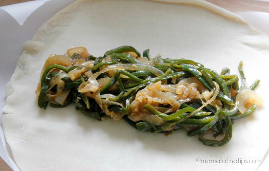 3. Extiende la costra sobre una hoja de papel pergamino para hornear. Extiende las rebanadas de queso en el centro de la costra, dejando una pulgada de espacio en la parte superior y en la inferior. Agrega las rajas en salsa de soya sobre el queso.