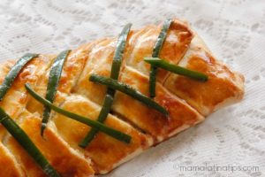 4. Con un cuchillo filoso corta la costra en líneas diagonales desde el centro hacia la orilla, tanto a la derecha como a la izquierda (como se ve en la foto). Dobla la costra hacia adentro en la parte superior. toma la primera tira de la derecha y colócala en forma diagonal sobre el relleno, luego toma una tira de la izquierda y colócala sobre el relleno, repite para ir formando la trenza. Antes de terminar, dobla la punta de la costra hacia el relleno y termina con la trenza.