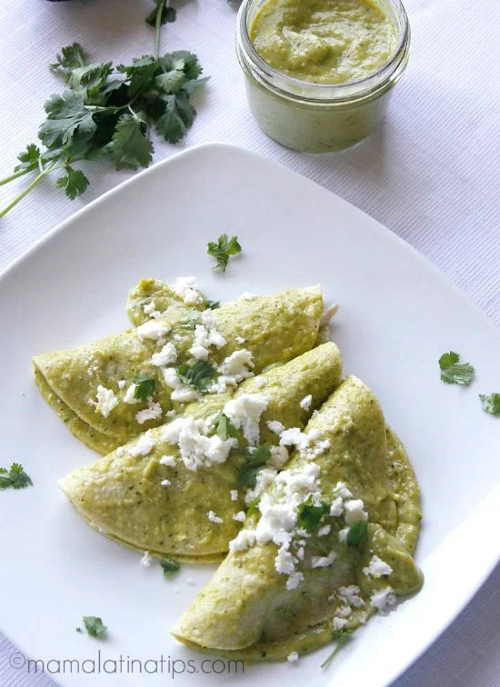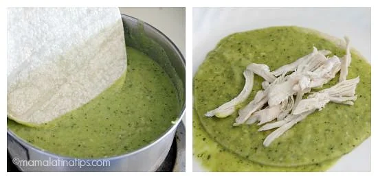 - Calienta las tortillas en un comal o microondas. Toma una tortilla, sumérgela en la salsa calientita, rellena con pollo, dobla y cubre con queso crema desmoronado. Repite.