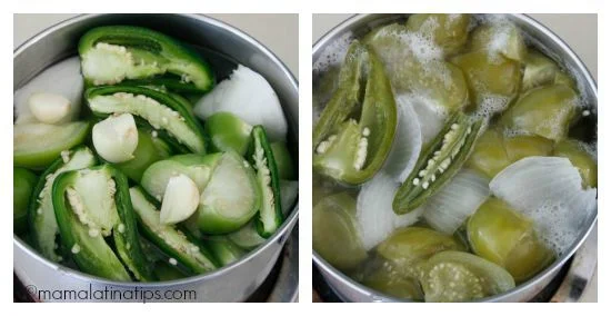 - Combina agua, tomatillos, serranos, jalapeños, cebolla, ajo, y calienta sobre fuego alto. Cuando suelte el hervor baja la temperatura y déjalos cocer por 3-4 minutos hasta que los tomates y chiles cambién de un color verde brillante a un color verde militar, como lo puedes ver en la foto.
