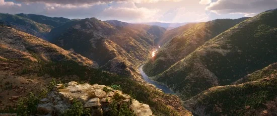 En esta foto de la película puedes claramente ver lo vasto de la naturaleza, ¿puedes ver al dinosaurio Arlo en ella? Eso nos muestra como hasta un dinosaurio puede perderse en su grandeza. Peter Sohn nos dice, “…todo es tan grande que te hace sentir chiquitito y te invade este sentimiento de crecimiento interior…”