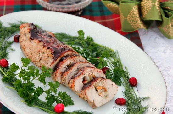 El lomo de puerco relleno es uno de esos platillos tradicionales que mi familia prepara para la Navidad. En esta ocasión decidí darle un giro de sabor e incluí uno de los sabores tradicionales del Día de Gracias, la salsa de arándanos, la cual combinada con el Jerez y el chile chipotle, que tanto nos gusta en México, crea una salsa agridulce y con la perfecta cantidad de picante.