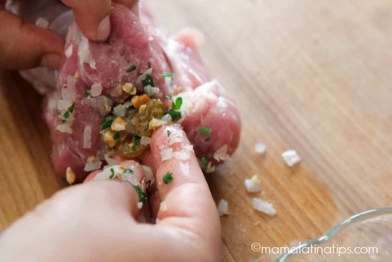 Rellena el lomo con la mezcla de cebolla usando tus dedos para que vayas empujando el relleno. Puedes hacerlo de los dos lados para asegurarte que cubra todo el centro del lomo.
