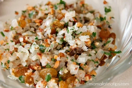 Combina cebolla, eneldo, perejil, almendras y pasas. Sazona con la sal al gusto y revuelve bien.