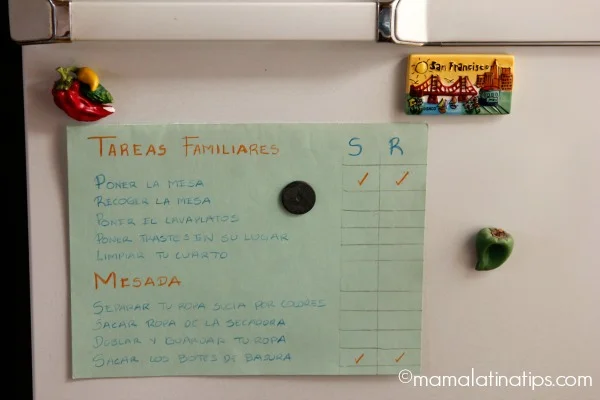 Simplemente tenemos una hoja pegada en el refrigerador donde los niños pueden ver claramente cuales son sus quehaceres de la casa y cuales son los trabajos para su mesada.