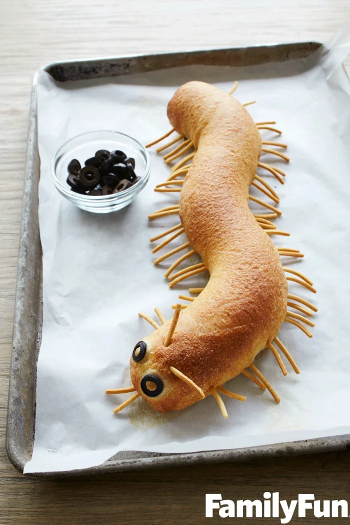 - Abre el paquete de pan francés y colócalo sobre la charola para hornear formando el cuerpo curvo del cienpiés. Añade los ojitos de aceituna, asegurándolos con unos palillos para evitar que se caigan durante el horneado.