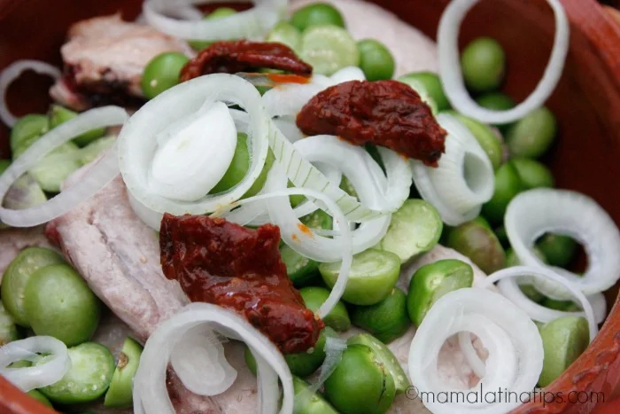 - Coloca los tomatillos, la cebolla, los chiles chipotles y la sal sobre las chuletas de cerdo doradas.