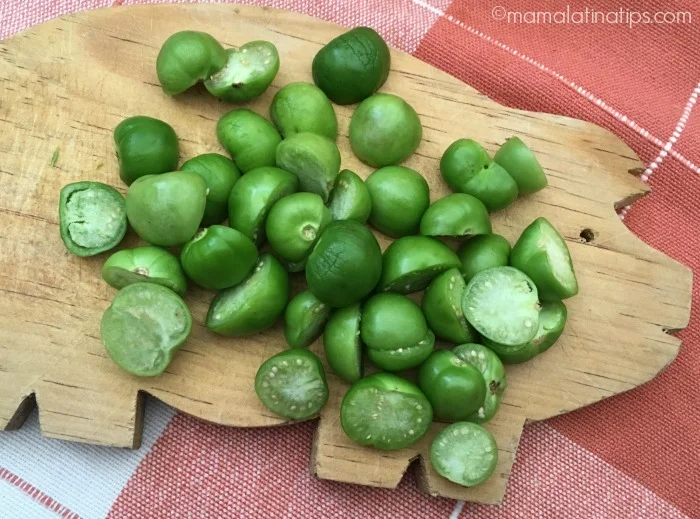 3. Parte los tomatillos por mitad si son pequeños o pícalos si son tomatillos medianos.