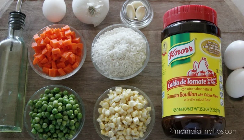 Me encanta además el contraste del arroz rojo y el blanco del huevo y queso. Para esta receta usé Knorr® Caldo de Tomate con Sabor a Pollo, lo compré así de grande porque siempre me gusta tenerlo en casa.