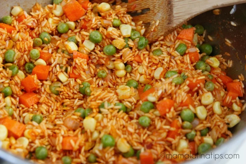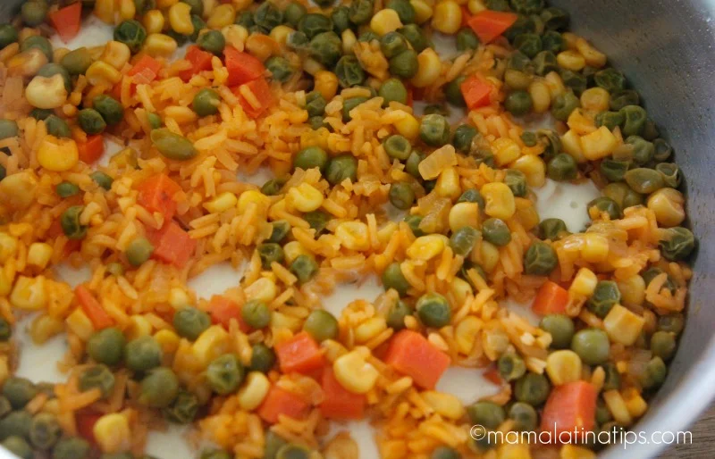 Cuando el agua comience a hervir, baja la temperatura y deja cocinar por aproximadamente 25 minutos o hasta que el agua se haya evaporado y el arroz esté cocido pero firme, no despedazado.
