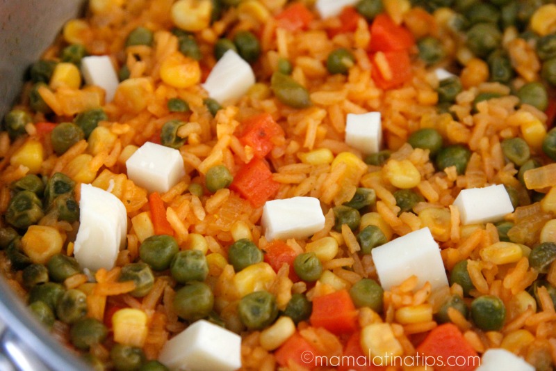 Destapa la olla e inserta las tiras de queso aleatoriamente en el arroz. Tapa nuevamente y deja reposar por 10 minutos para que el queso se derrita.