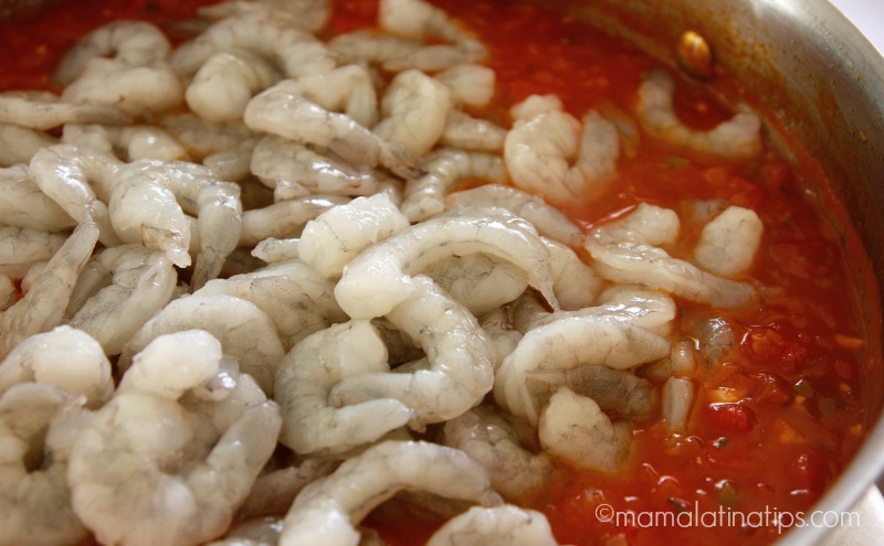 Finalmente sumerge los camarones en la salsa, y moviendo de vez en cuando cuece por 4-6 minutos o hasta que tomen un tono rosado.