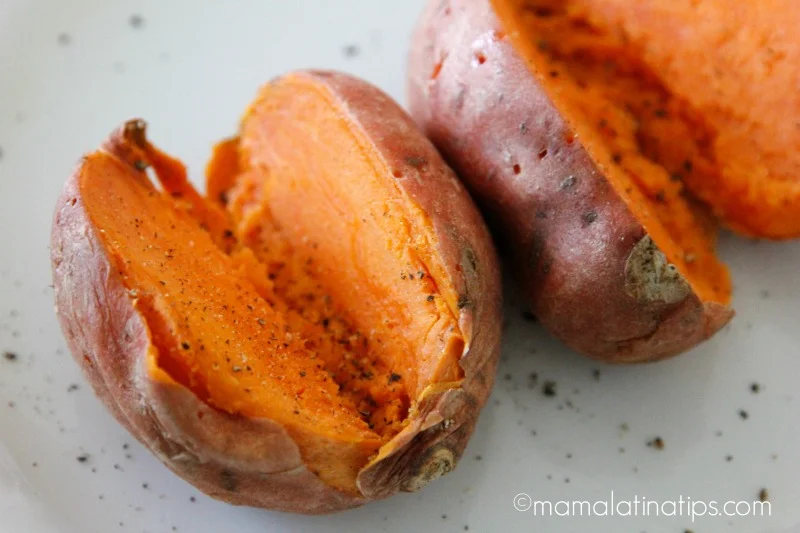 Cuando los camotes estén cocidos. Cortá por mitad a lo largo. Salpimenta al gusto.