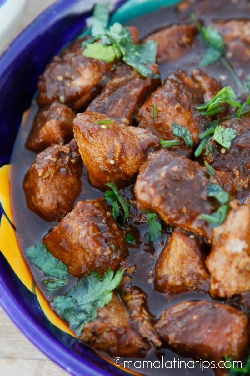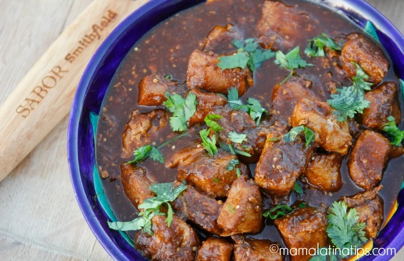 Así que en honor de mi abuelita hoy te comparto la receta de carne de puerco en chile negro. Hay muchos platillos que me hacen pensar en ella, y este es uno de ellos. Recuerdo verla con su mandil enfrente de una gran cazuela friendo la carne y preparando la salsa. Y luego sentarnos en la mesa a comer con arroz, frijoles y tortillas. ¡Qué rico!