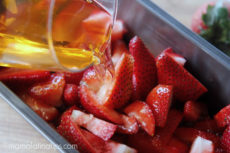Lava, descorazona y quita la patita de las fresas. Pícalas en cuartos y colócalas en un molde para hornear pan metálico. Como este.