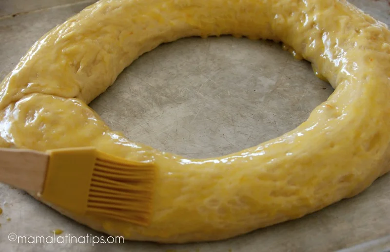 - Mezcla la yema de huevo con la leche y barniza la rosca con la brocha de cocina.