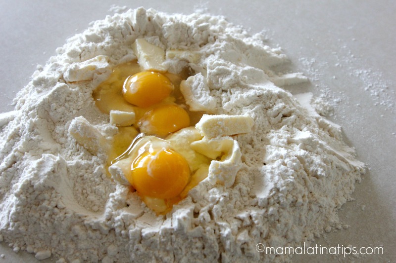 En una superficie plana, crea una fuente o volcán con la harina, vacía la sal alrededor pero por la pared fuera del volcán. Vacía la leche calientita en el centro y con tus manos o un tenedor comienza a mezclar.