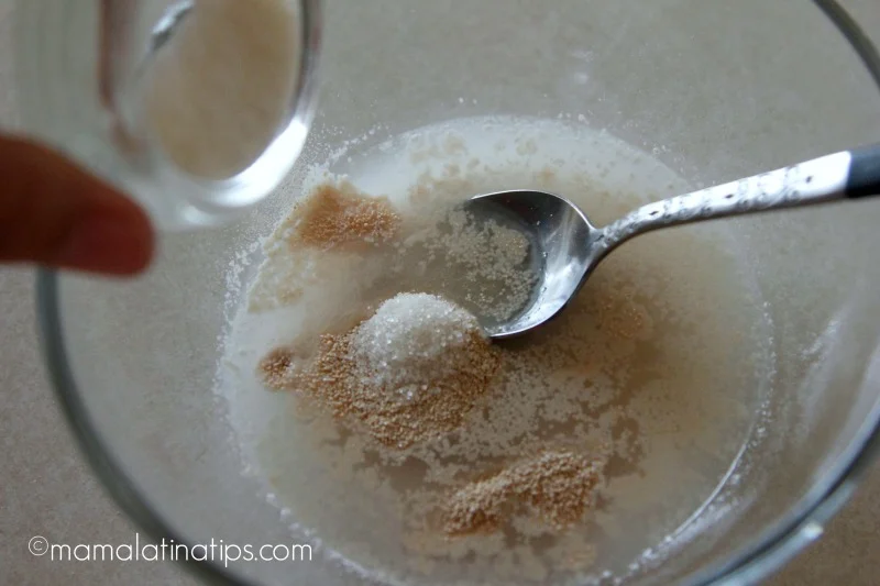 - Vacía el agua caliente en un tazón pequeño de cristal, espolvoréa la levadura seca sobre ella, añade la cucharada de azúcar y revuelve bien hasta que todos los grumos hayan desaparecido.Coloca en un lugar calientito, sin por 15-20 minutos o hasta que empiece a formar burbujas. A veces sube su tamaño mucho (como se ve en la foto) a veces sólo se ve con burbujas.