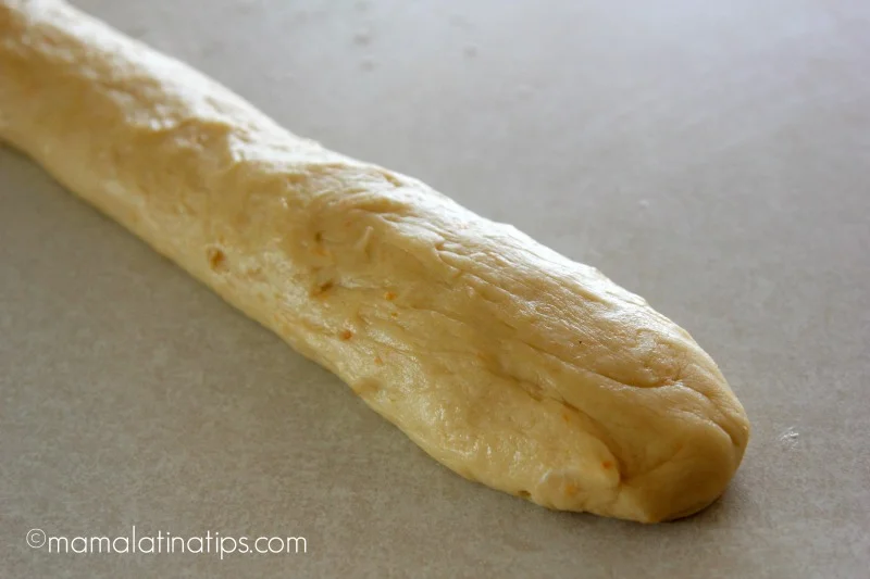 - Una vez que la masa a doblado su tamaño vacíala sobre una superficie enharinada y con cariño amásala por unos segundos para remover el gas que se haya formado en la fermentación. Con un rodillo forma un rectángulo largo asegurándote que es del mismo grosor. Luego toma una de las orillas y empieza a enrollar la masa, terminarás con una tira larga