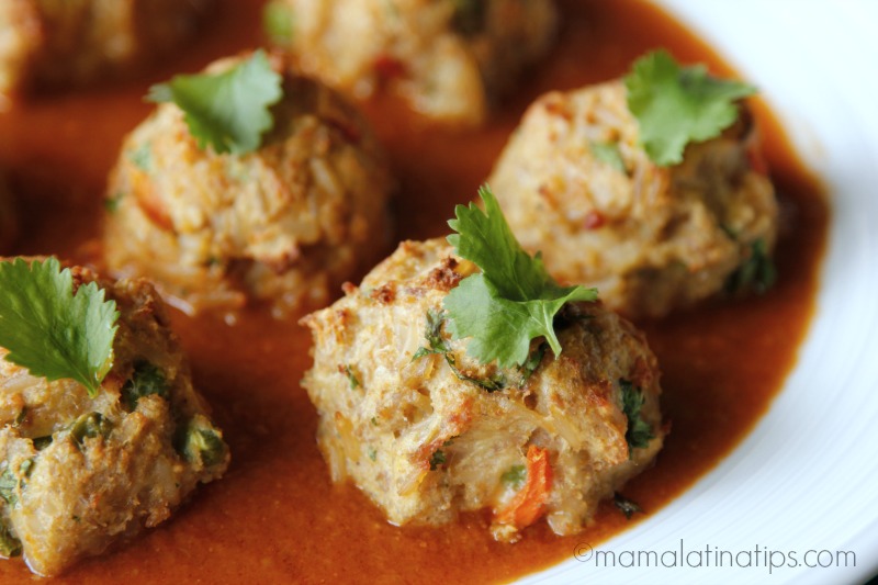 Mi mamá muchas veces agregaba arroz a nuestras clásicas albóndigas en salsa roja, así que agregar el arroz frito me pareció una variación natural y deliciosa. En cuanto a hacerlas de pollo se remonta a aquella ocasión en la que una amiga vino de visita a mi departamento cuando estaba en a Universidad. Al llegar de la escuela me sorprendió con un delicioso plato de albóndigas de pollo en salsa verde, lo cual fue una revelación para mi.