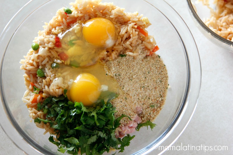 - Combina 1 1/2 tazas del pollo y arroz frito que acabas de calentar (deja el resto aparte para el momento de servir), la carne de pollo molida, huevos, pan molido, sal y pimienta. Mezcla bien.