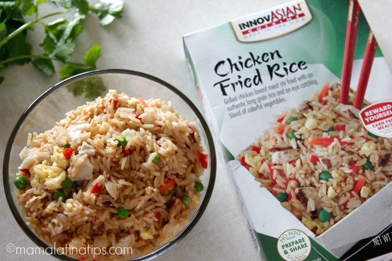 Por lo que para esta receta combiné el hermoso recuerdo del arroz de mi mamá con la receta de albóndigas de pollo de mi amiga usando la caja de Innovasian® Chicken Fried Rice que me encontré en el congelador. El arroz frito le añade una buena cantidad de verduras y color sin mayor trabajo, además está preparado y sazonado por chefs expertos.