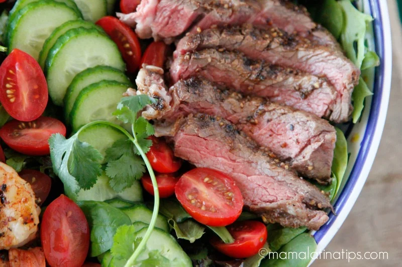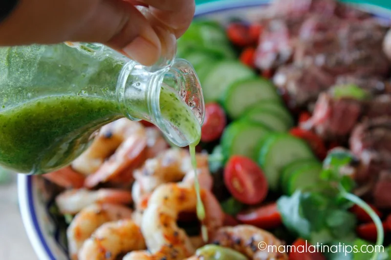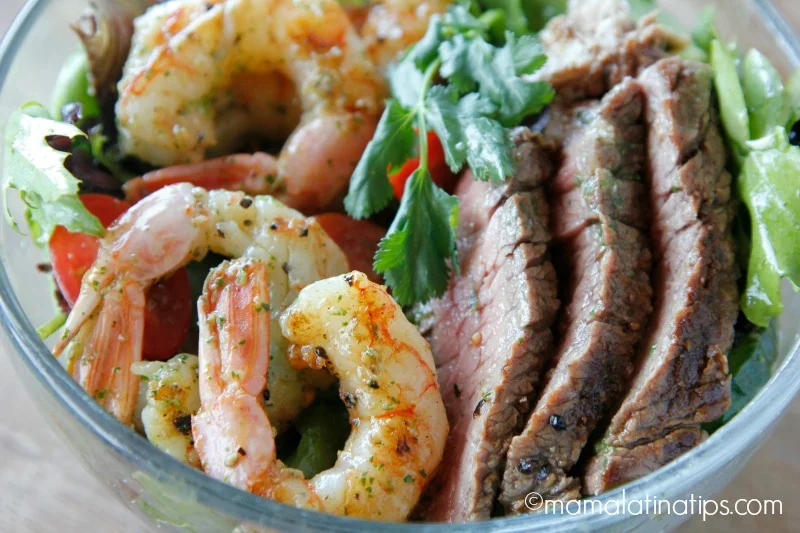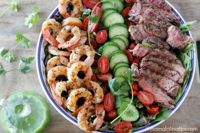 Esta ensalada mar y tierra con aderezo de cilantro combina lo mejor de los dos mundos. El jugoso filete de res de la tierra, y los tiernos camarones del mar. Ambos asados a la parrilla y servidos sobre una cama de mezcla de lechugas y verduras. Cubre con el aderezo y listo. ¿A poco no suena fantástica?