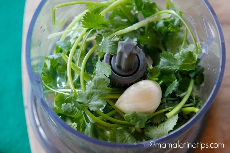 - En un procesador de alimentos o licuadora, mezcla el cilantro, el ajo, el vinagre, la otra cucharadita de sal y pimienta al gusto. Muele hasta lograr un aderezo terso. Añade la ralladura del limón. Mezcla bien.