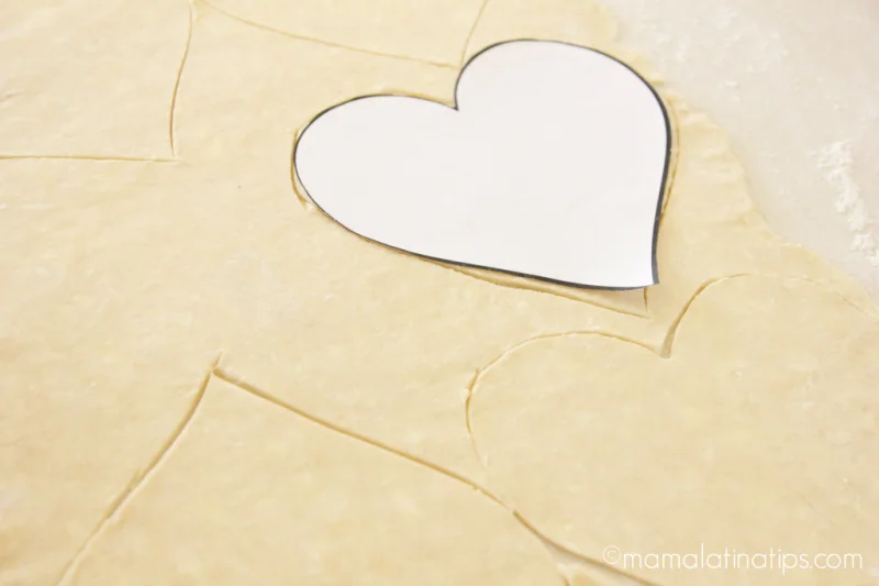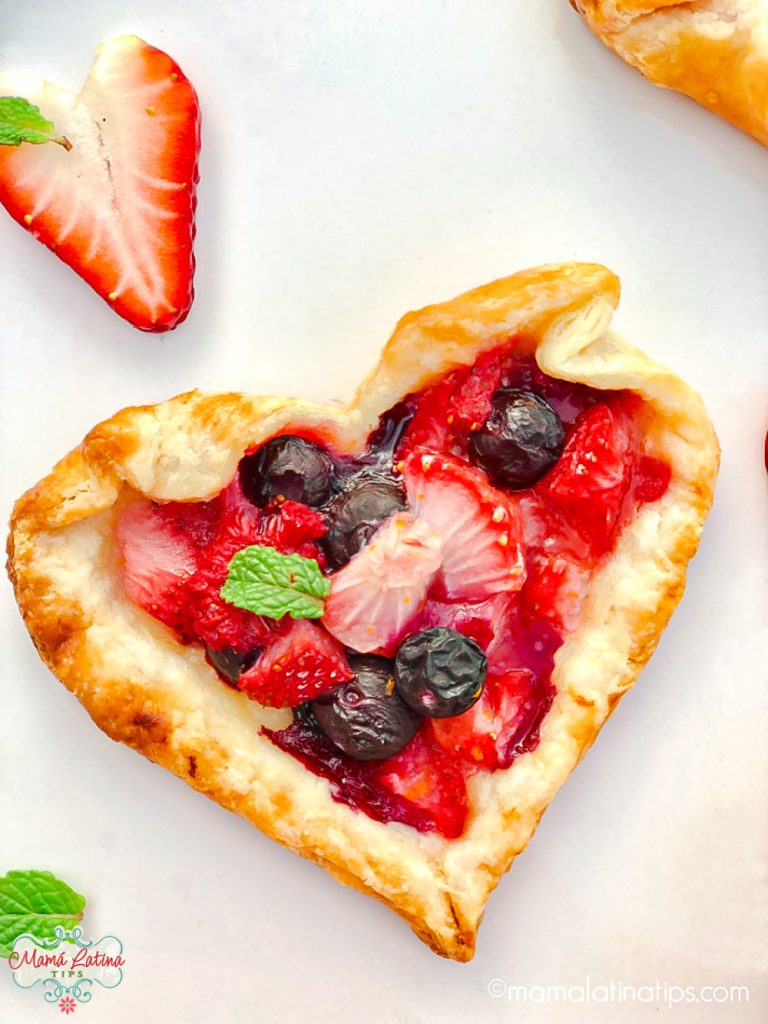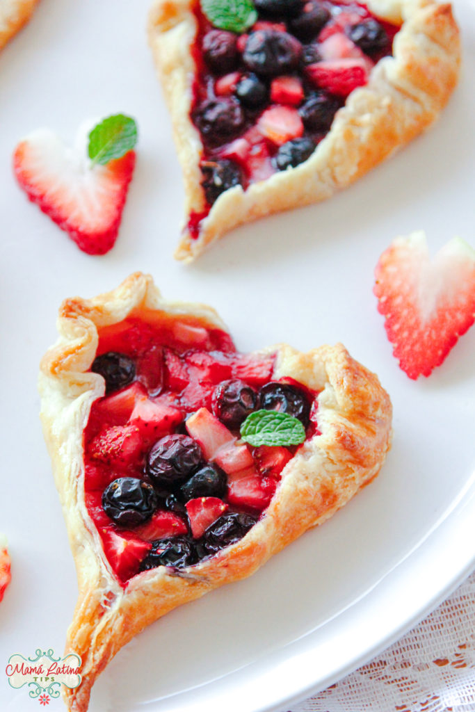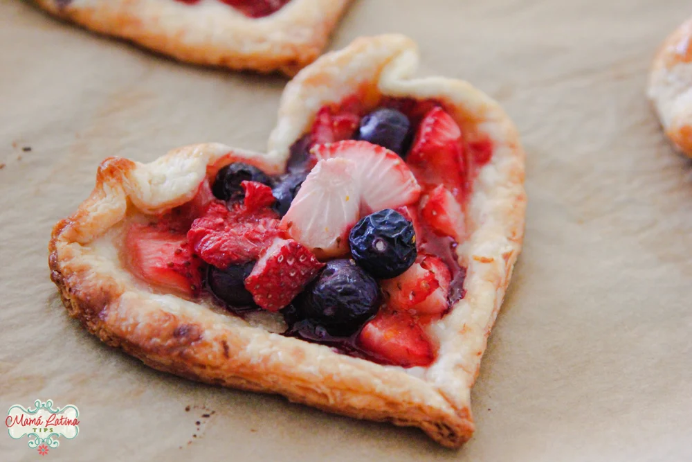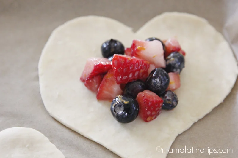 Puedes usar un molde de galletas de corazón si lo prefieres y encuentras el tamaño, pero sinceramente para hacer estas bellezas sólo necesitas tus manos para doblar las orillas y semi-cubrir la fruta que está en el centro.