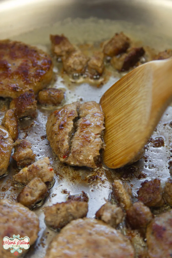 Para esta receta utilicé dos tipos de salchicha (sausage como le decimos en Estados Unidos), debo aclarar que no es la tradicional salchicha de los perros calientes, es más bien como tortitas o bolitas de carne molida con especias.