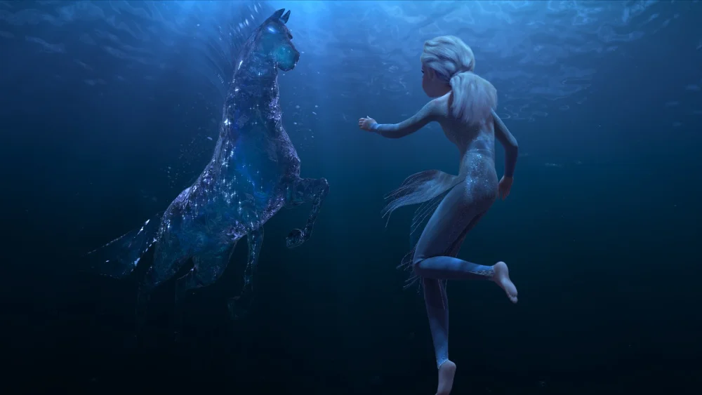 Las imágenes de Elsa bajo el agua quitan el aliento de lo reales y bellas que son. Como esta del encuentro de Elsa con un Nokk, un espíritu místico de agua que toma la forma de un caballo y usa su poder para proteger los secretos del bosque.