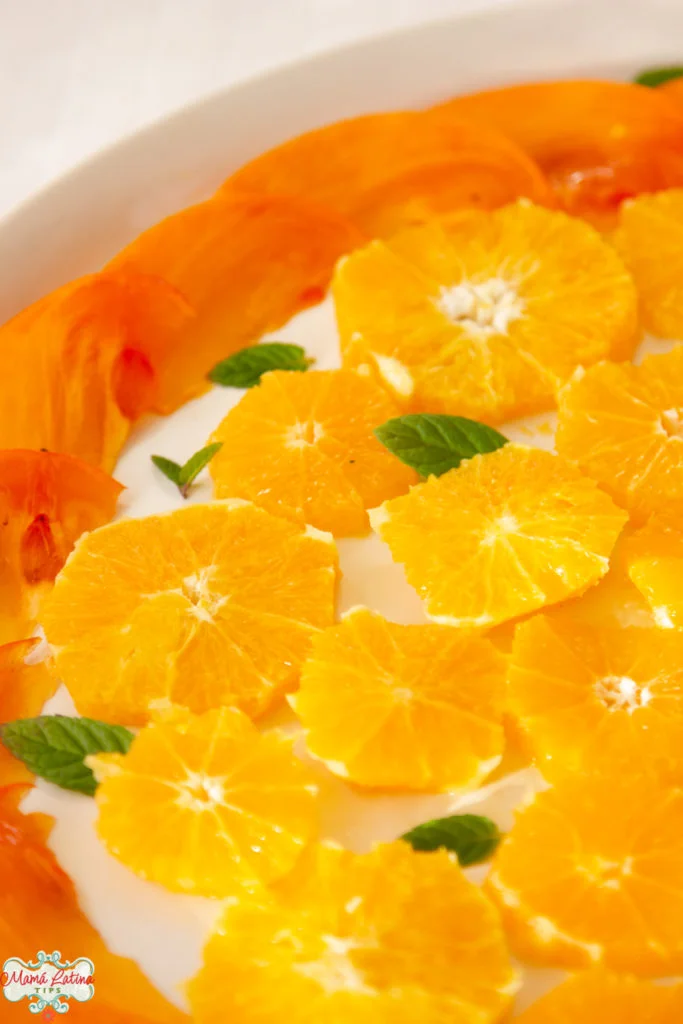 Te aconsejo que busques las frutas de temporada. En mi caso preparé un platón con naranjas y mandarinas en rodajas y rebanadas de persimmon.