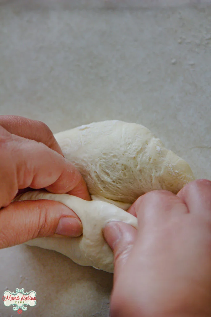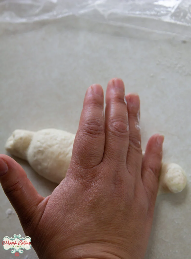 - Dobla las orillas hacia el centro y sigue enrollado hasta formar un rollo apretado y medio gordito. Luego con tus dedos meñiques has presión mientras sigues rodando la masa para formar las orejas del pan, o sea la terminación redonda de las orillas del bolillo.