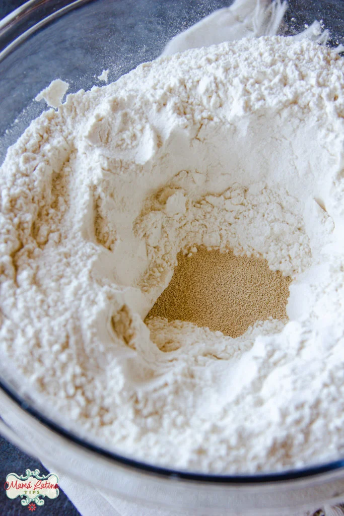 - En el tazón mediano mezcla muy bien harina y sal. Haz un agujero enmedio y vacía la levadura.