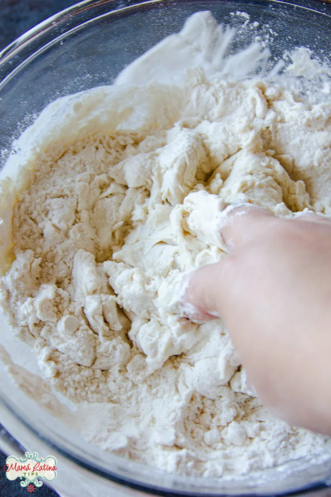 Tip: Toma un poco de harina con tu mano limpia y frota tus dos manos juntas para desprender toda la harina que se ha pegado a la otra mano.