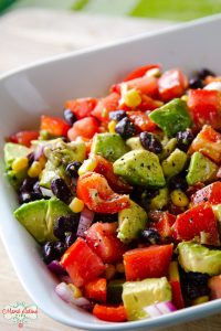 ensalada de aguacate, elote y frijol con jitomates y chiles pimientos en una ensaladera blanca