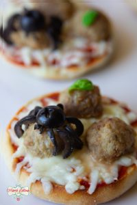 English muffins cubiertos con salsa, queso y albóndigas. Las arañas de aceitunas son un toque perfecto para halloween. Estas mini-pizzas son una comida muy fácil de hacer para la temporada