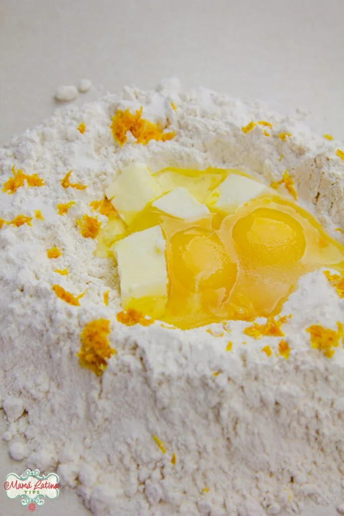 Coloca los huevos, la mitad de la mantequilla en trozos, otra cucharada de azúcar y la ralladura de naranja en el centro de la fuente y con tus dedos comienza a mezclar tomando poco a poco harina de la parte interior de la fuente.